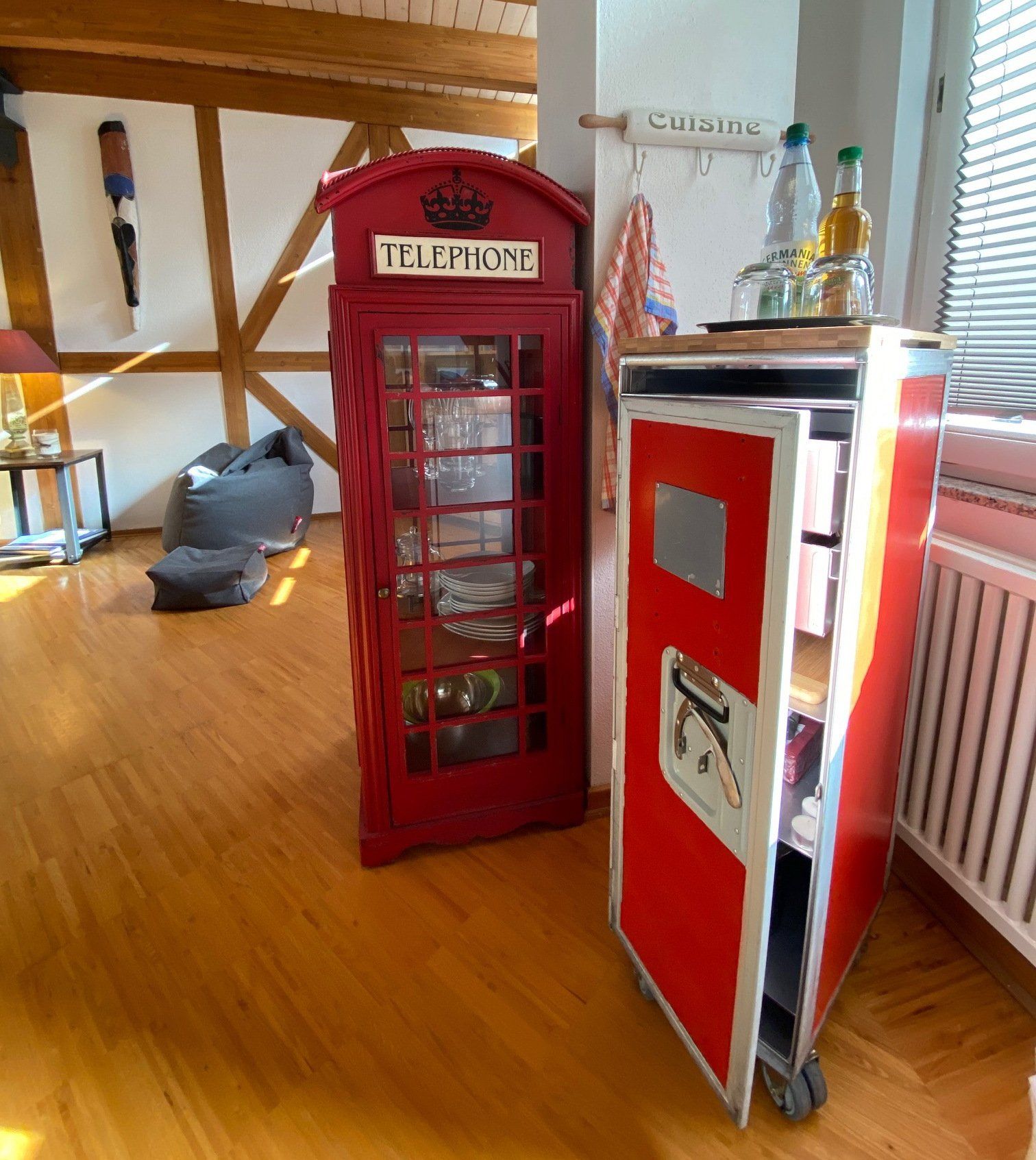 - eine Kochecke mit Herd, Kühlschrank, Spüle, Kaffeemaschine, Wasserkocher, Mikrowelle und diversen Küchenaccessoires
